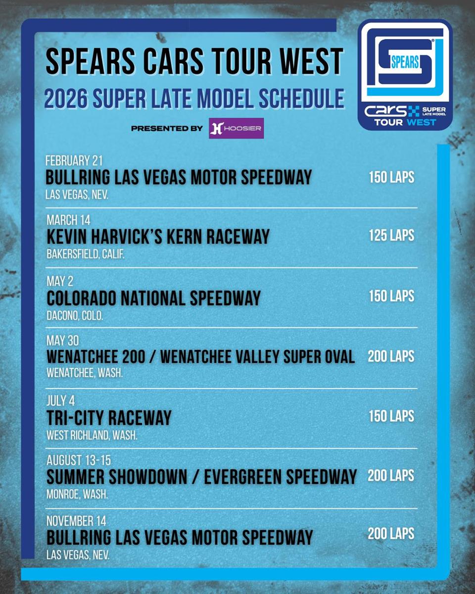BAKERSFIELD, Calif. (Sept. 26, 2025) – The Spears CARS Tour West today unveiled a seven-race schedule for its Super Late Model division for the 2026 season - a two-race increase from the number of 2025 events. The expanded slate features stops in four states: California, Colorado, Nevada and Washington, opening with a 150-lap showdown at The Bullring at Las Vegas Motor Speedway on Feb. 21, and returning to Las Vegas for SLM championship weekend on Nov. 14.